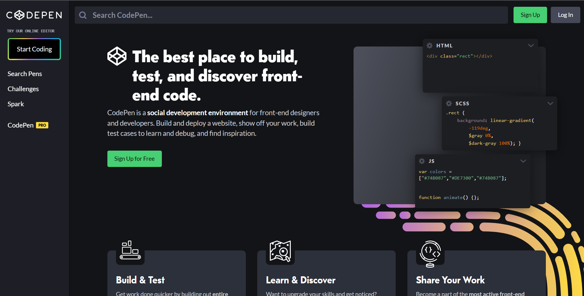 An online code editor, learning environment, and community for front-end web development using HTML, CSS and JavaScript code snippets, projects, and web applications.
