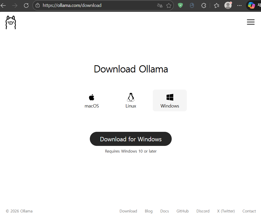 아래 사이트에서 Ollama 다운 받아서 설치한다.