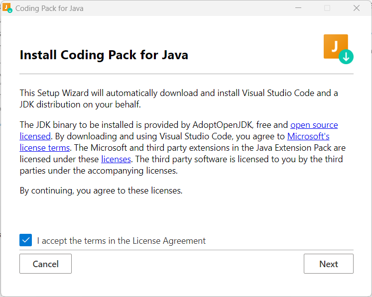 나 같은 경우 VScode와 JDK를 미리 설치해서 설치돼어다고 나온다.