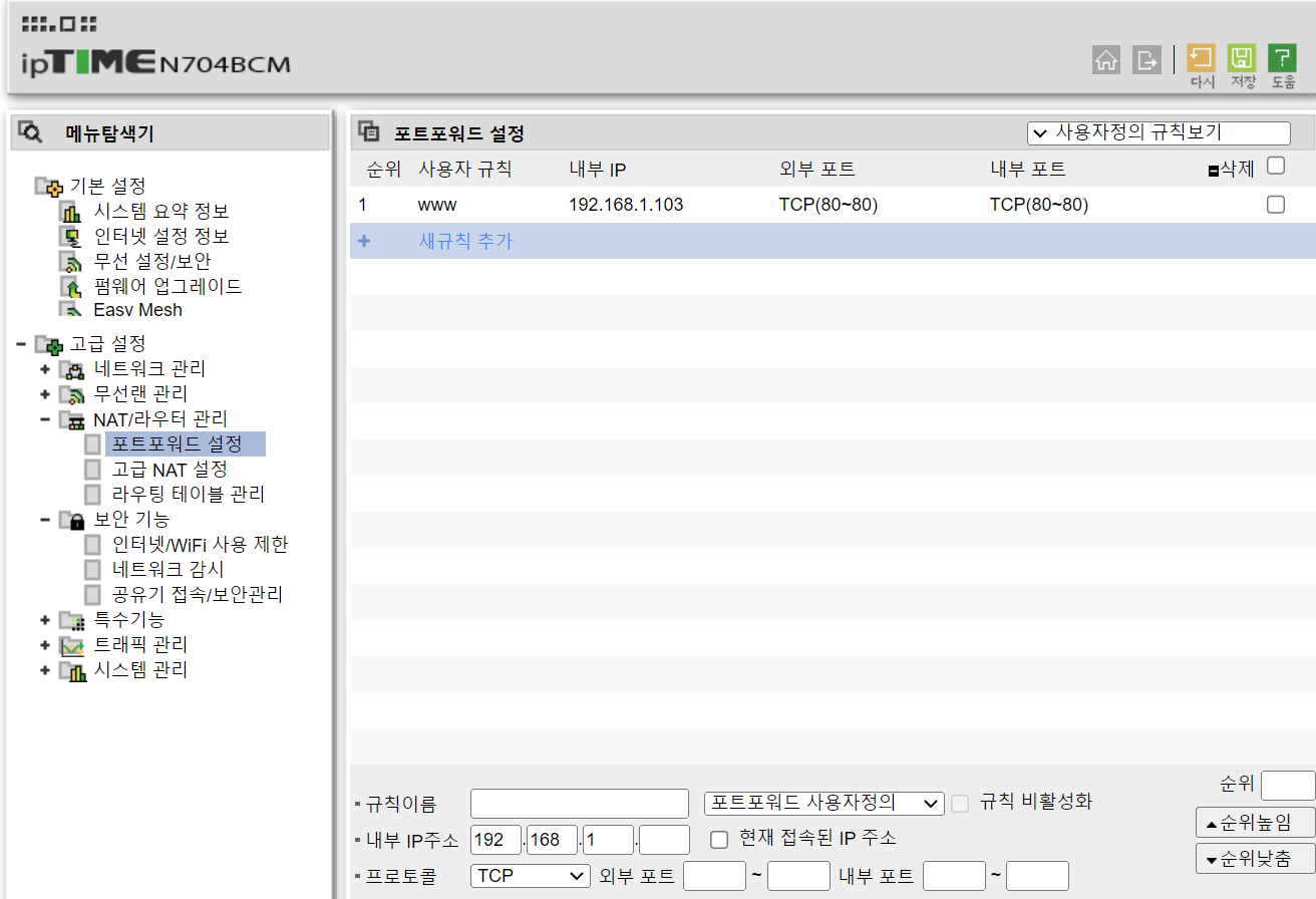 예제로 IPTIME 공유기를 예로 들며 아래와 같이 설정한다.