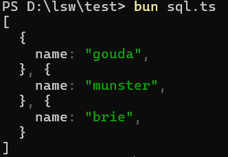 const result = db.query("SELECT * FROM cheeses;").all();